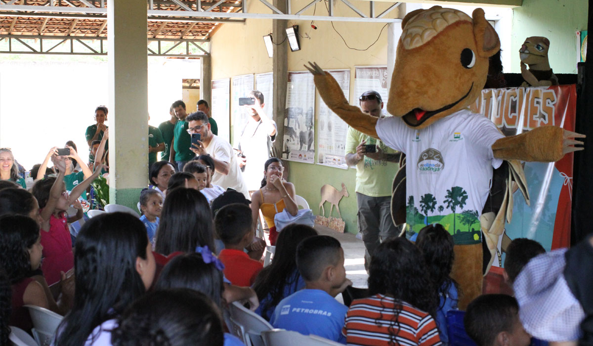 Após a fábula, aparece o “Tatutinga”, mascote do projeto No Clima da Caatinga, para abraçar e interagir com as crianças. “Queremos despertar esse cuidado com o meio ambiente já na infância, promovendo um elo afetivo entre as crianças, a fauna e a flora”, destaca Marília Nascimento, coordenadora de educação ambiental da Associação Caatinga.